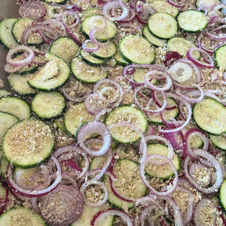 Zucchini und Zwiebeln mit Olivenöl vermengen.